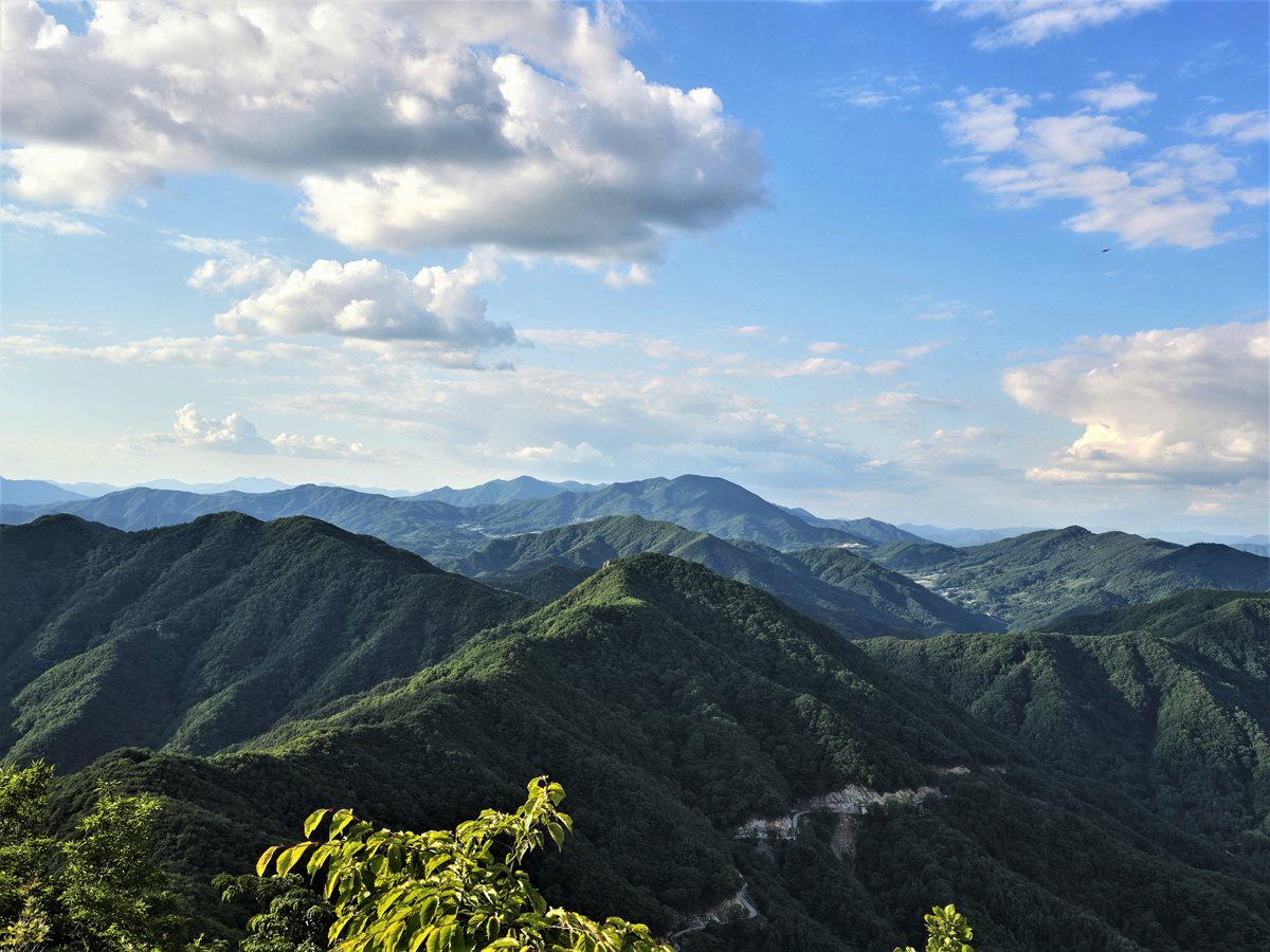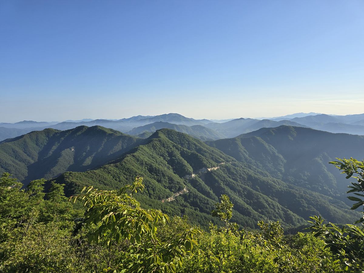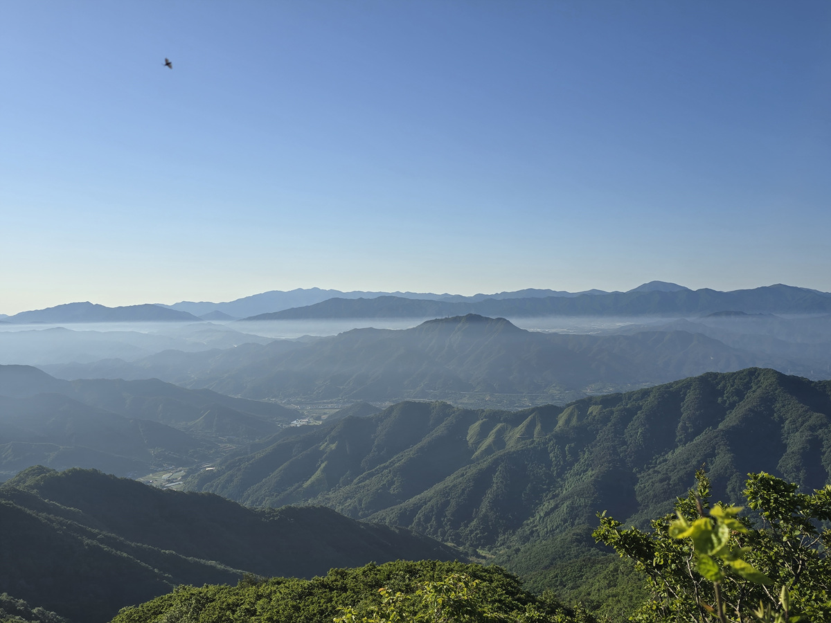 용평제 주차하고 가파른 1km 정도 지겨운 시멘트 포장길과 코가 땅에 닿을 정도로 급경사를 오르면 시원한 바람과 함께 아름다운 풍경이 펼쳐진다. 정상은 나무 데크가 설치되어 있다. 현재는 공사 중이다. 지리산 천왕봉에서 시작해 덕유산까지 이어지는 백두대간의 탁 트인 조망이 너무 좋다.
