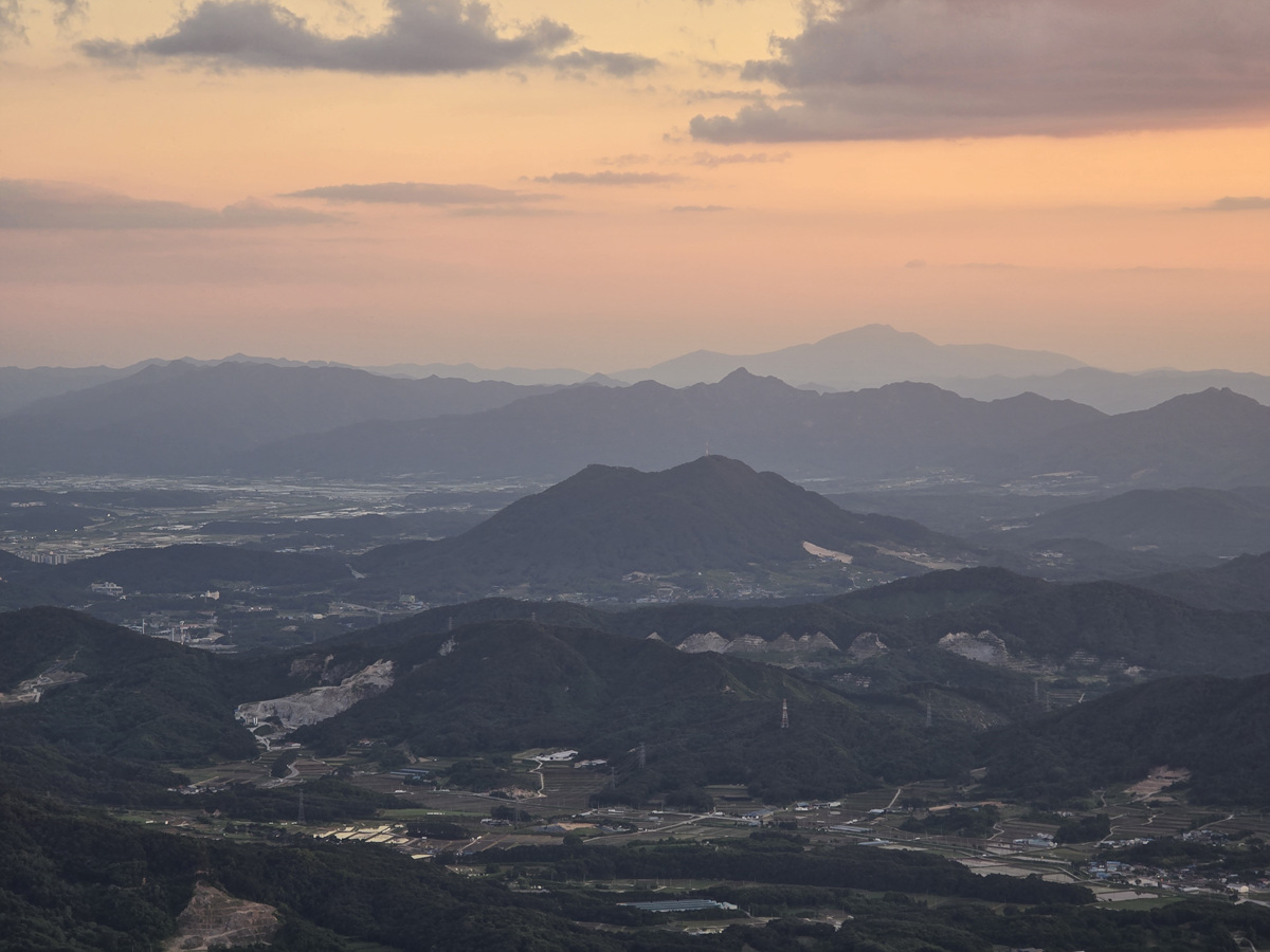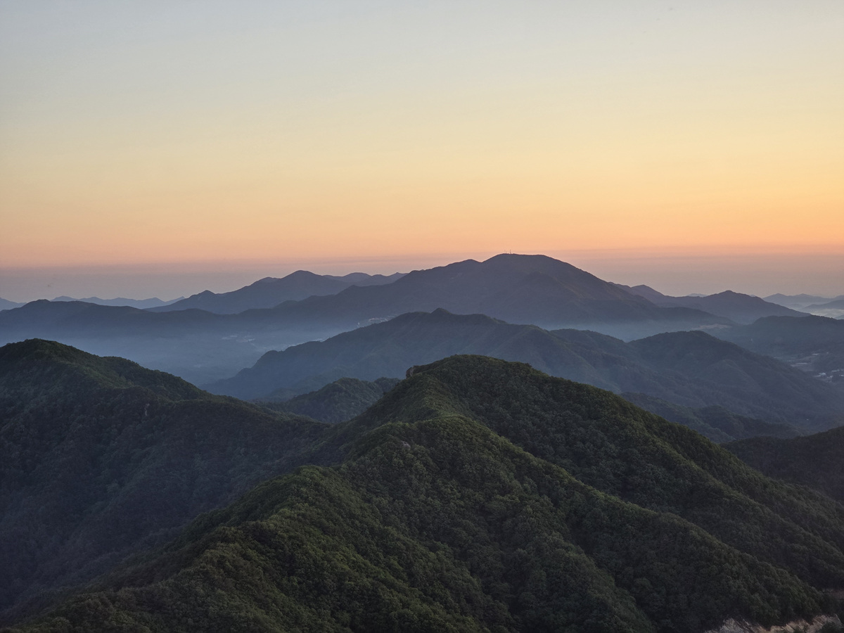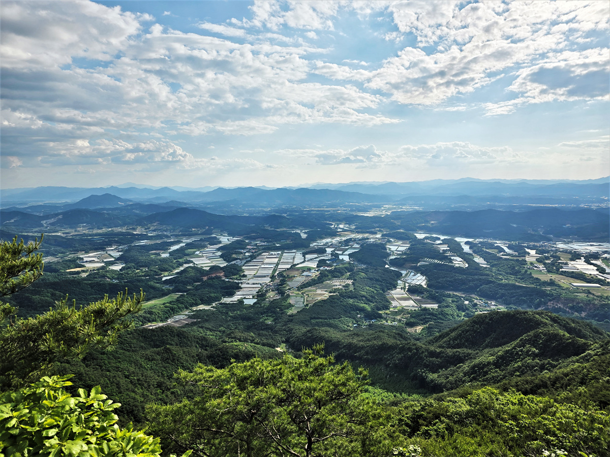 용평제 주차하고 가파른 1km 정도 지겨운 시멘트 포장길과 코가 땅에 닿을 정도로 급경사를 오르면 시원한 바람과 함께 아름다운 풍경이 펼쳐진다. 정상은 나무 데크가 설치되어 있다. 현재는 공사 중이다. 지리산 천왕봉에서 시작해 덕유산까지 이어지는 백두대간의 탁 트인 조망이 너무 좋다.